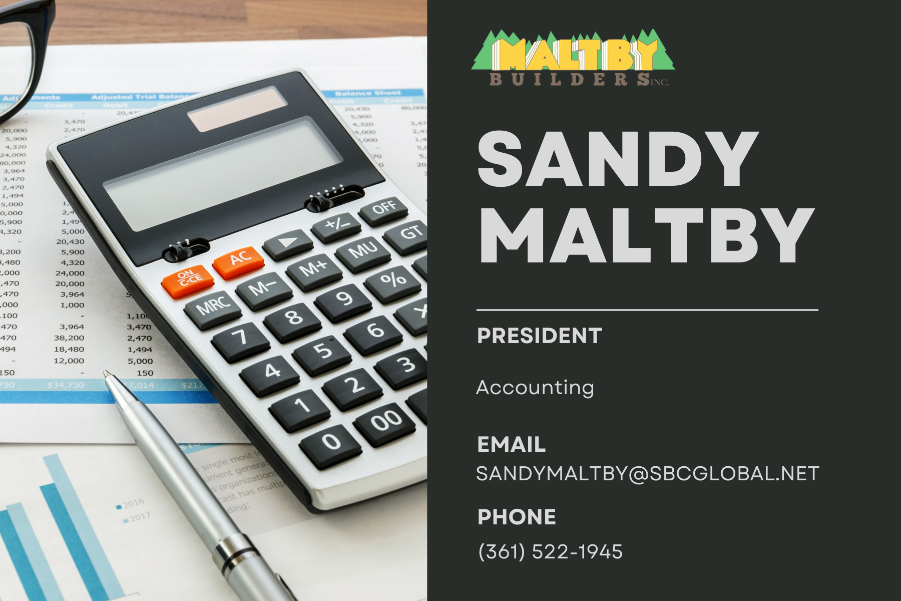 Sandy holds a BBA in Accounting from the University Of Texas (1982) and obtained her CPA license in 1986. With almost 40 years of experience, Sandy oversees the accounting needs of Maltby Builders.