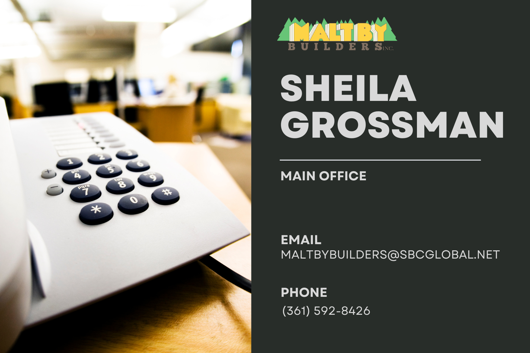 Sheila serves as our mainline to Maltby Builders. She helps to maintain client and employee relations and offer the inquiring public general assistance, should you have and questions about Maltby Builder’s Inc or who to contact for additional information.